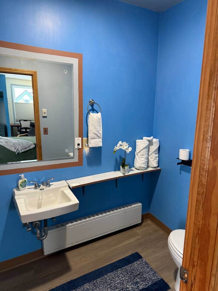 This space is 1 room with King bed and private en-suite bathroom. Featuring a 65" Smart Roku TV, retro inspired mini frig and micro, state of the art sit/stand desk w/high speed WiFi and Ethernet connection, and Keurig coffee maker. Large windows for natural light with top/bottom black out blinds. Individual digital room heat control and remote control lighting. Full service Cafe on 1st floor offering room service or sit down.